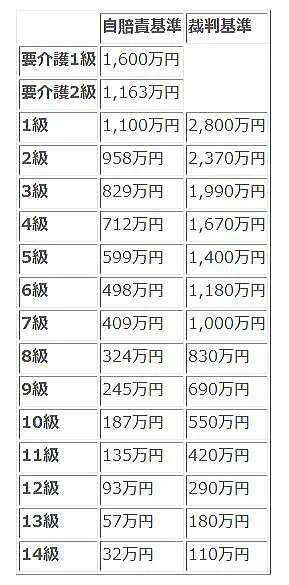 後遺障害慰謝料は、事故によって後遺障害が生じたという精神的苦痛に対する賠償です。これも、判例の積み重ねによって、以下の通り、一応の基準が作られています。これも、任意保険会社基準というのが別にあり、弁護士が被害者側の代理人に立たない場合は、保険会社は独自の基準に基づく相当に低い慰謝料額を提示してきます。